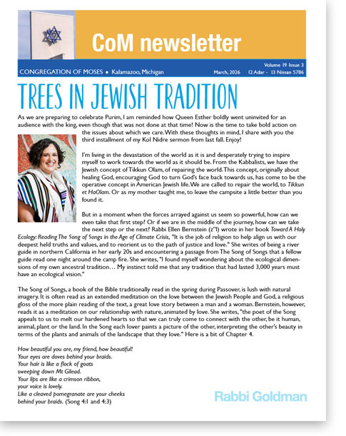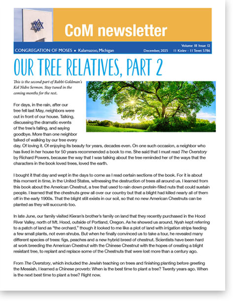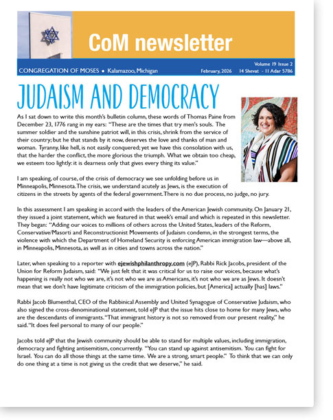 Welcome to the Congregation of Moses Monthly Newsletter Stay in touch with everything going on at CoM and in the Kalamazoo Jewish community. Latest Edition Please click on the image to read the newsletter. Subscribe * indicates required Email Address *