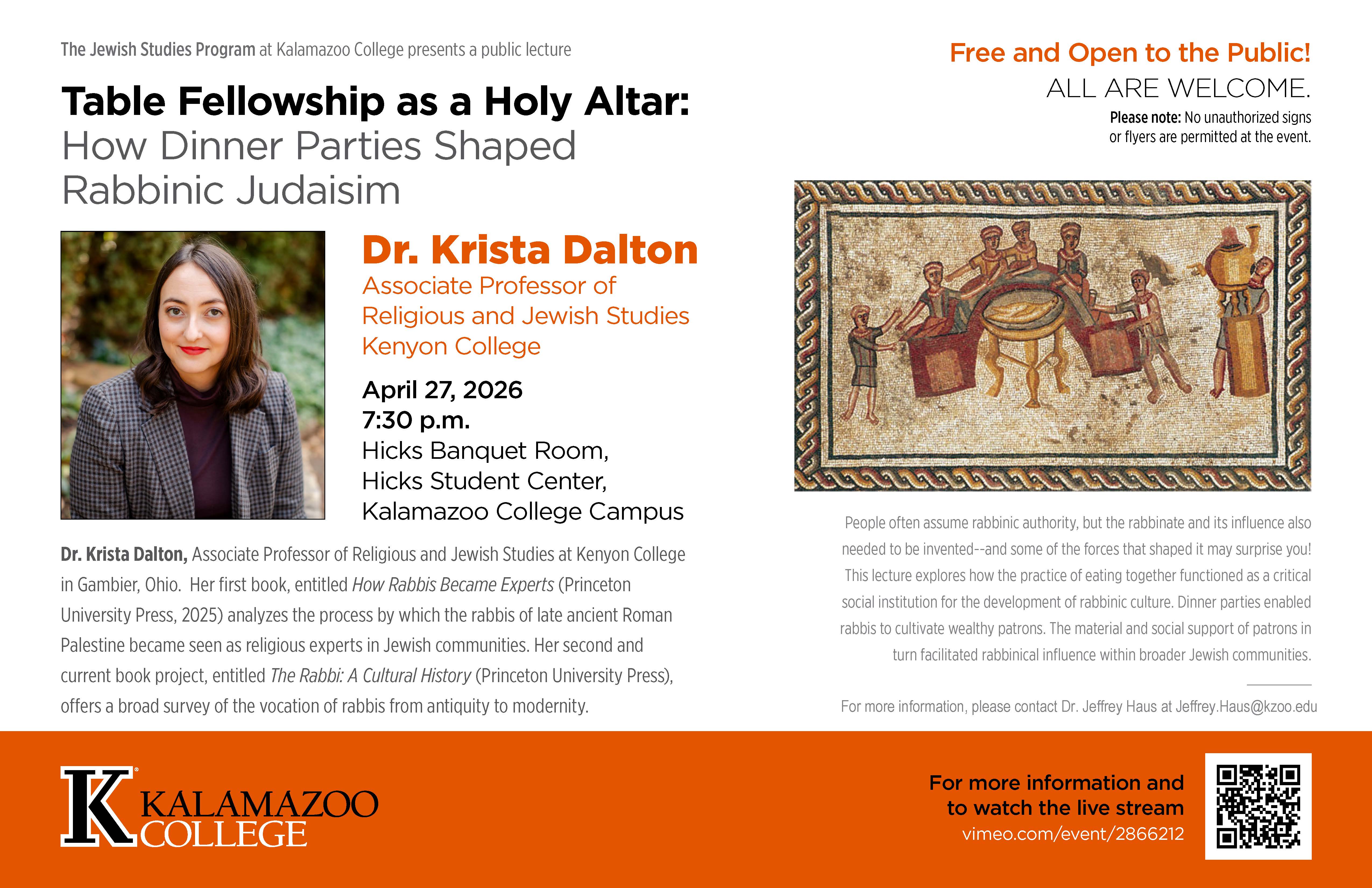 Congregation of Moses News ← Back to NewsPrint / Save as PDFFree Kalamazoo College Public PresentationMarch 25, 2026The Jewish Studies Program at Kalamazoo College presents a public lecture, with Dr. Krista Dalton.